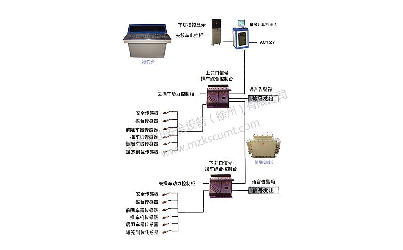 《煤礦安全規程》382條規定“箕斗提升必須采用定重裝載”的規定。主井提升信號及定重裝載系統系統可實現井下定重裝載自動控制,井上數據管理和卸載系統自動控制。系統由稱重傳感器、井上下PLC可編程控制箱、裝載液壓站、井上下操作臺及絞車房狀態顯示箱等組成。