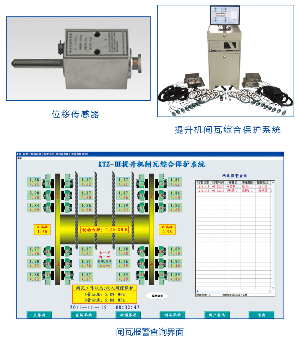 提升機制動器閘間隙報警裝置,通過接觸式閘間隙傳感器、貼閘壓力傳感器、電磁換向閥動作傳感器和油壓傳感器, 對制動裝置運行參數(shù)例如閘間隙、 貼閘壓力、碟形彈簧曲線、油壓等進行實時在線監(jiān)測、數(shù)字化顯示,設(shè)置了電磁換向閥憋卡、閘間隙超限等故障預(yù)測和報警功能,若監(jiān)測到使安全緊急制動失靈的信號,如電磁閥換向閥卡死無法泄油制動等, 直接參與控制,自動打開緊急回路泄油制動,避免事故發(fā)生。
