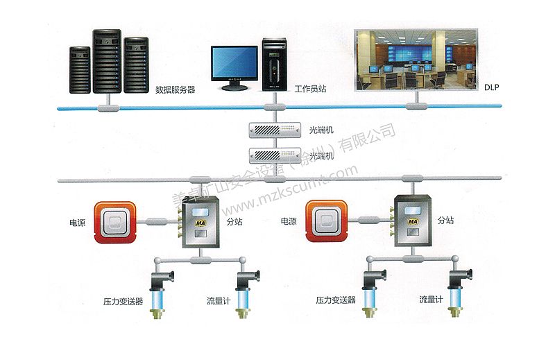 ●顯示功能:在地面集控室由工控機顯示各壓風管路壓力、各供水管路流量。設有各設備的故障信號顯示,并伴有報警。